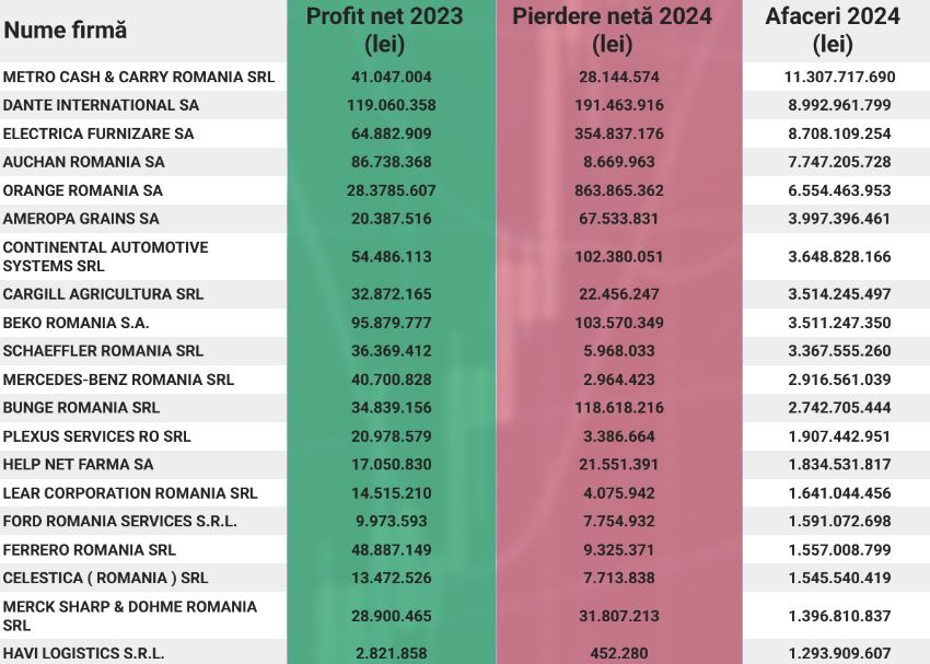 Metro, eMAG (Dante International), Orange, Beko sau Mercedes-Benz sunt unele dintre marile companii din România care au trecut de pe profit net în 2023 pe o pierdere netă în 2024.