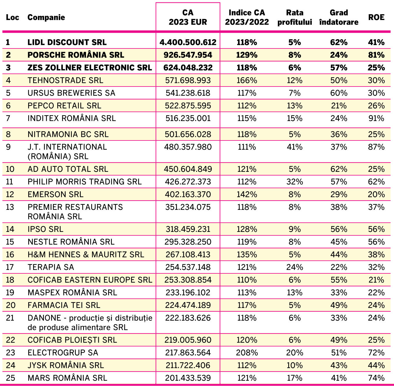 Cele mai mari 25 de companii din România au generat o cifră de afaceri de 341,4 miliarde de lei, reprezentând 19,3% din PIB. Aceste companii, majoritar din retail, energie și auto, au contribuit cu aproape 20% din PIB-ul României.